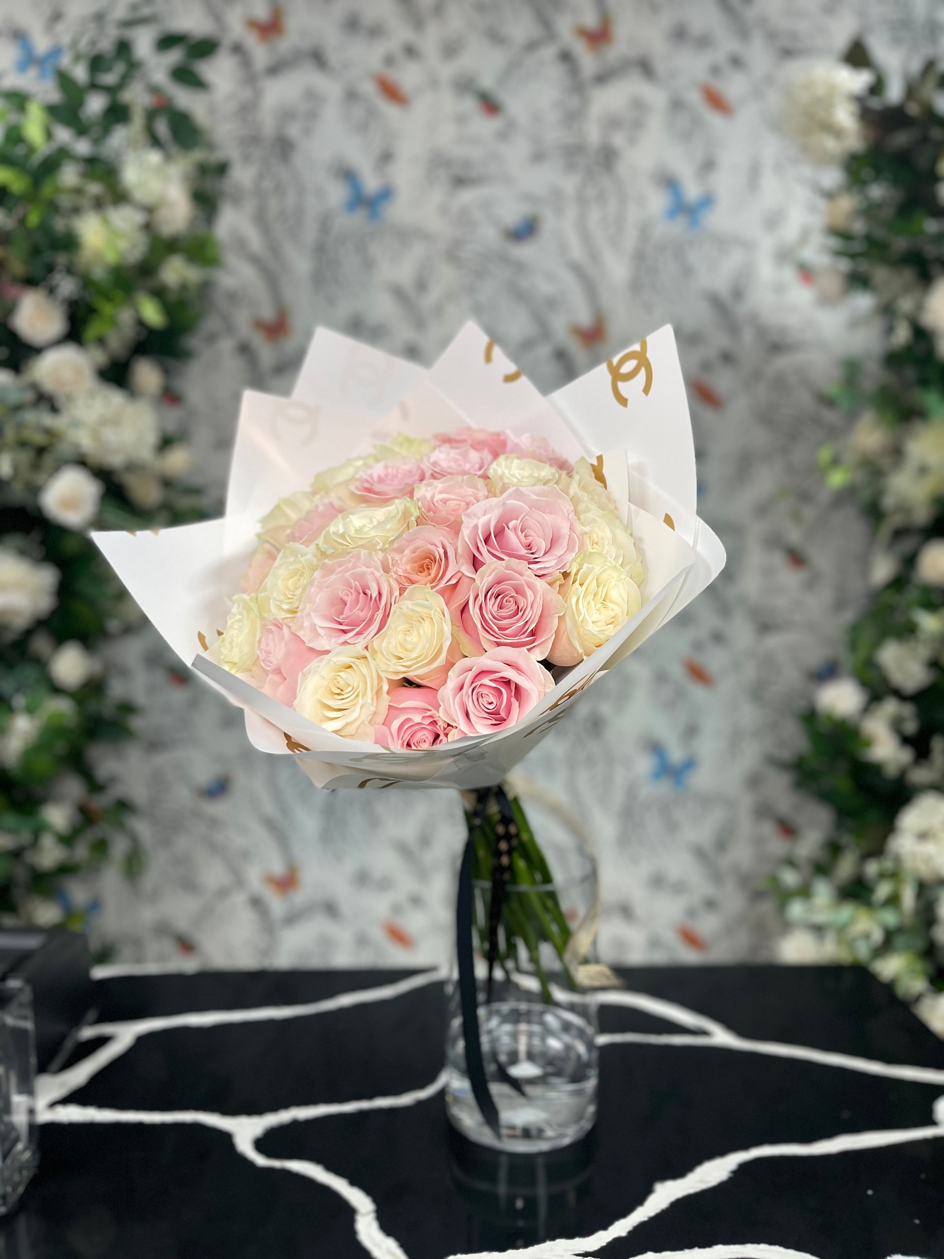 Indulge in the Sweetheart Bouquet, a luxurious and exclusive floral arrangement that showcases large pink and white roses. Wrapped in exquisite designer paper, this stunning bouquet is the perfect expression of love and elegance.