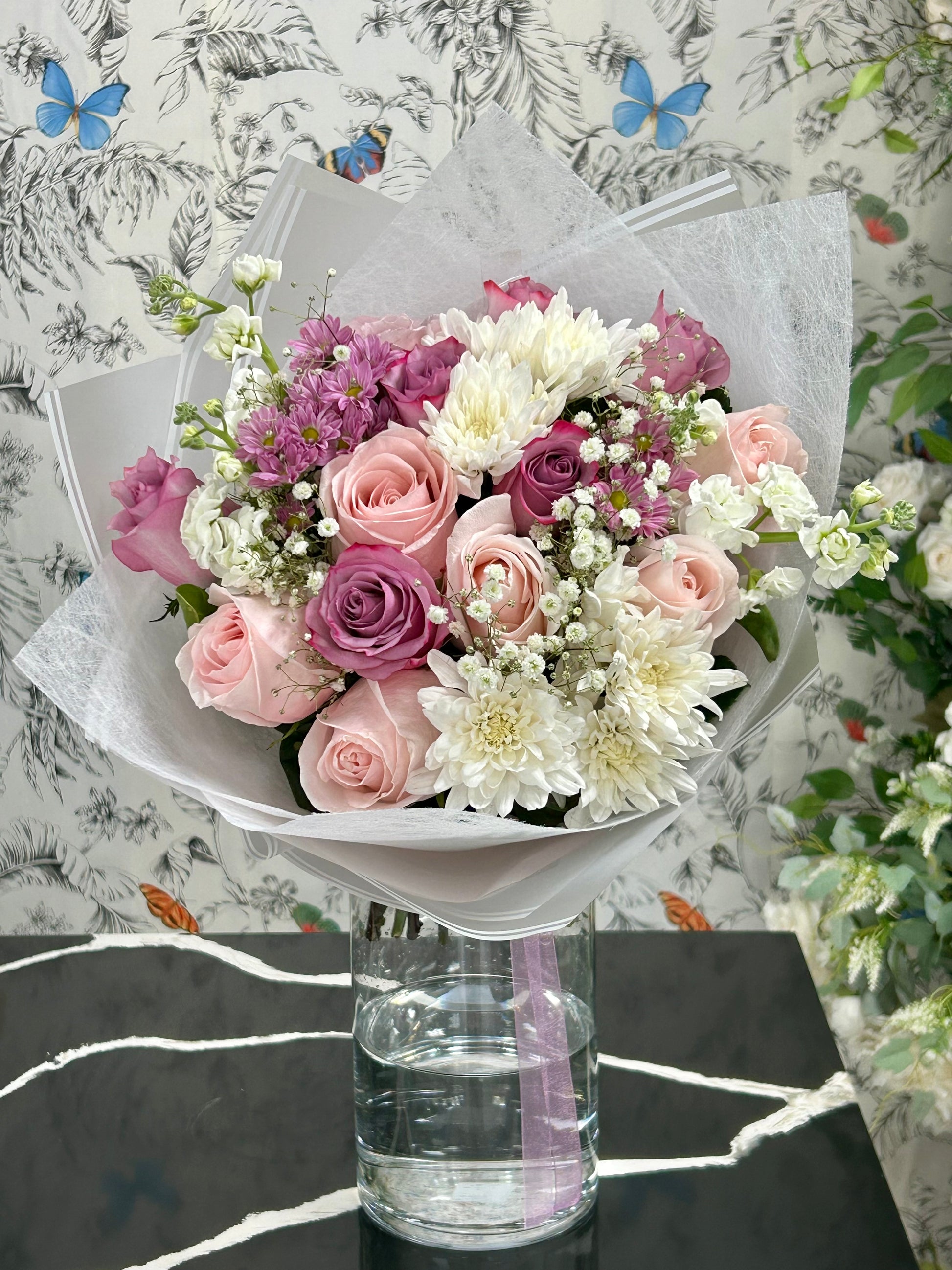 Experience the beauty of our Aurora Bouquet, named after Aurora, the beloved princess from Sleeping Beauty. This enchanting arrangement, one of our best sellers, harmonizes shades of purple, blush, and white. It features elegant roses, delicate baby’s breath, and vibrant chrysanthemums, expertly combined to create a fresh and captivating display. Each flower is thoughtfully selected to bring a sense of joy and sophistication to any occasion.