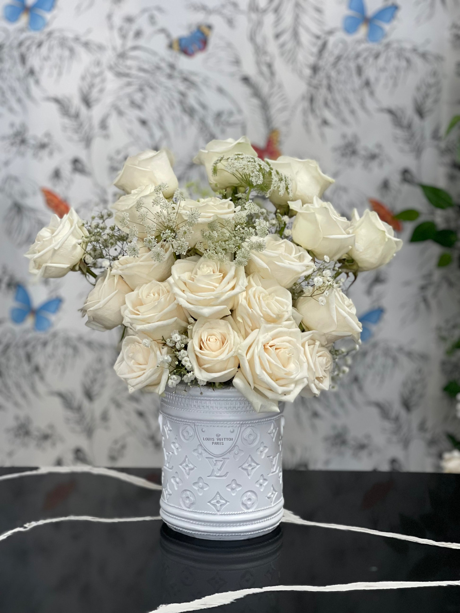 Indulge in luxury with the Blanc Cannes, an exquisite floral arrangement that features delicate white roses elegantly arranged in our coveted designer vase. This stunning piece is designed to elevate your space and evoke the sophistication and refinement of the French Riviera, making it a perfect addition to any home or office decor.