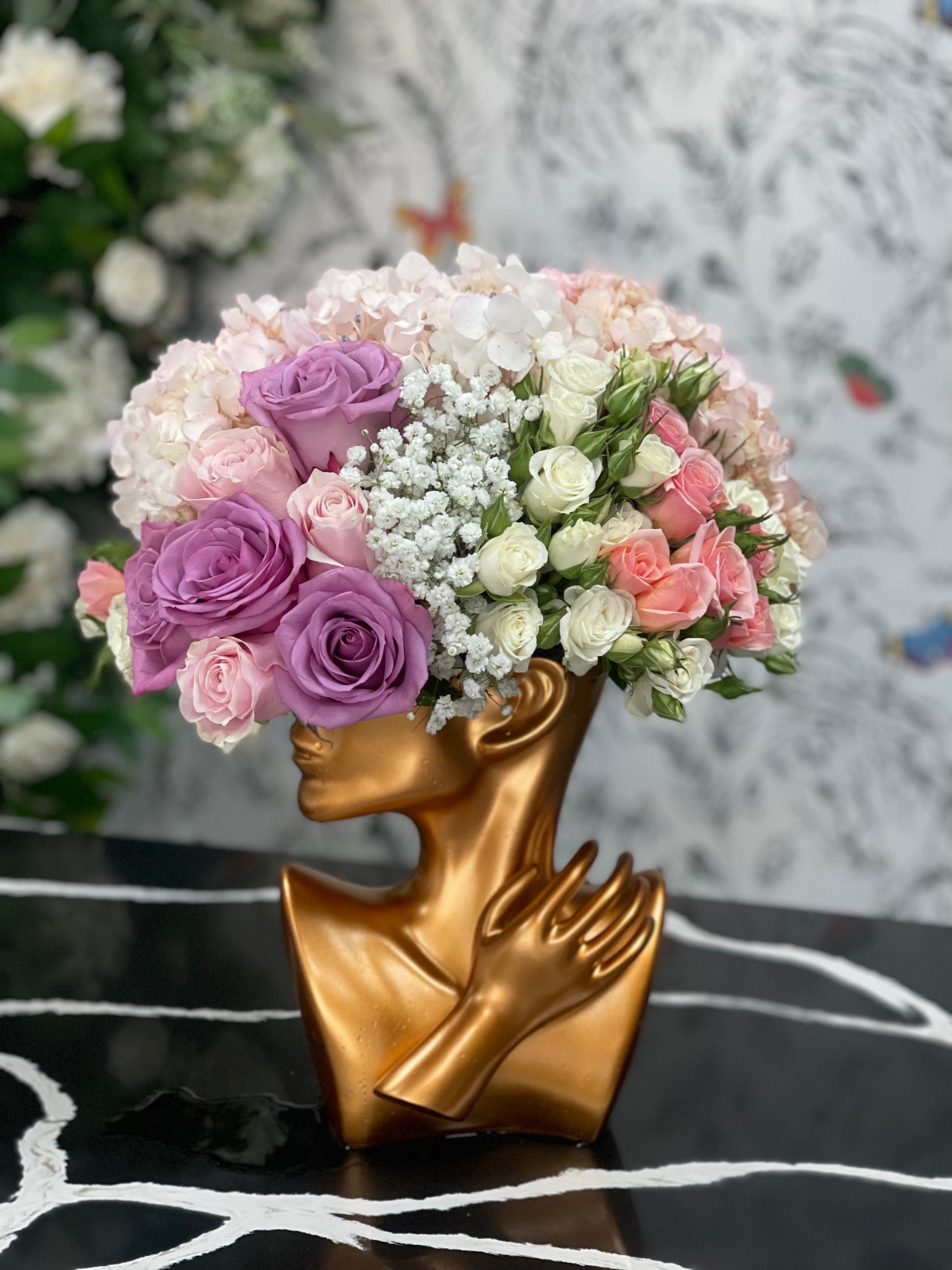 Brain Storm is a breathtaking luxury vase that embodies the essence of femininity. This stunning piece is expertly designed to resemble the graceful form of a woman, creating a striking focal point for any space. Filled with fresh mixed blooms and the highest quality Ecuadorian roses, this arrangement captures the beauty of nature while showcasing exquisite artistry.
