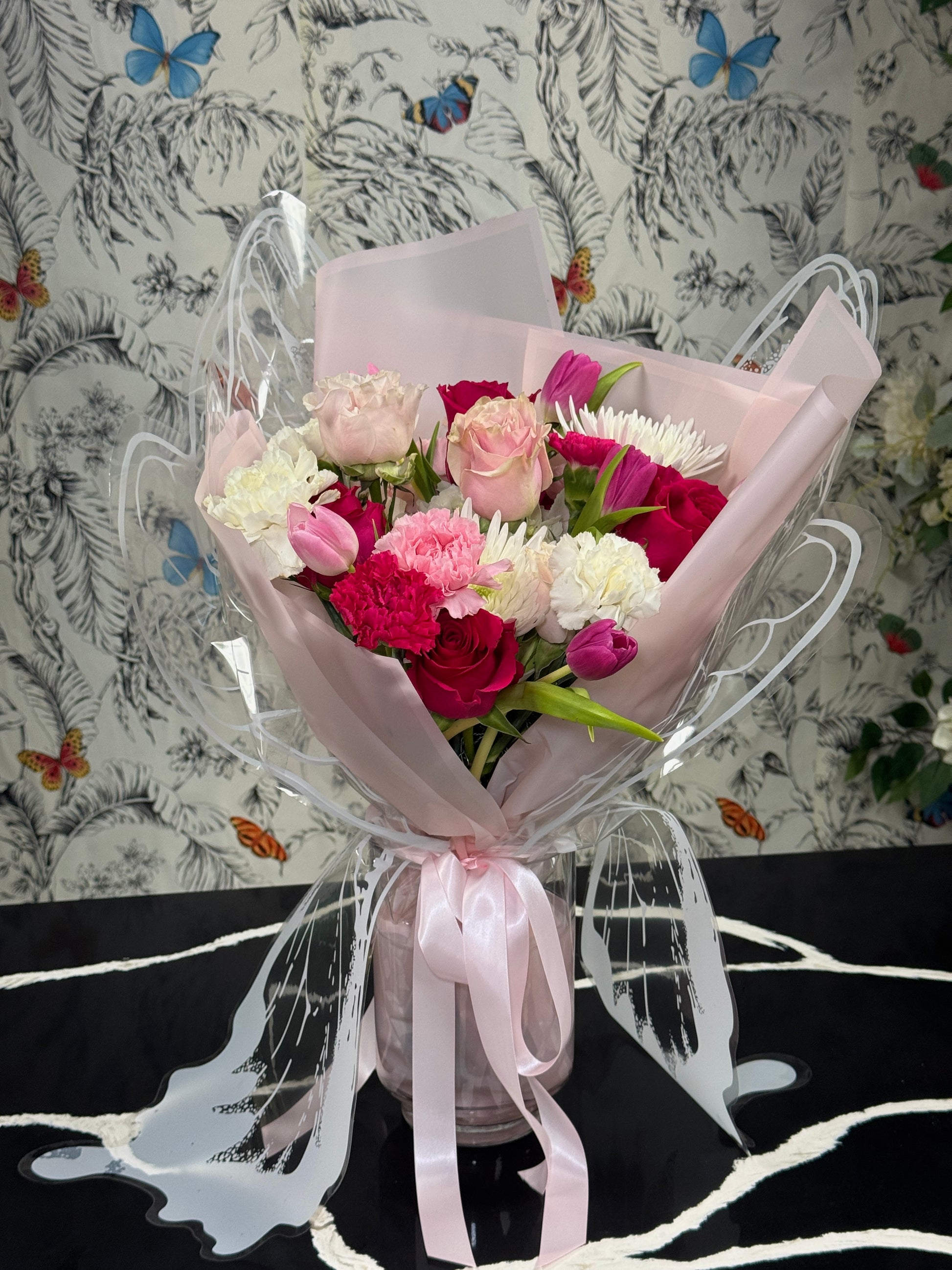 Introducing our Butterfly Bouquet, a stunning medium-sized mixed bouquet perfect for any special occasion, especially Valentine’s Day and Galantines Day. This exquisite arrangement features premium pink and white blooms, including lush roses, chrysanthemums, carnations, and delicate tulips, thoughtfully hand-picked for their beauty and freshness.