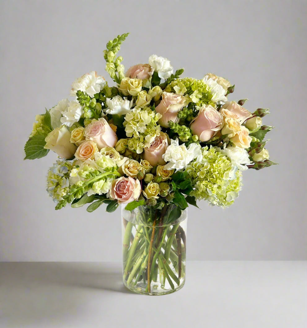 As calming as a whisper and as elegant as a lullaby, the Cotton Vase is a tranquil arrangement that speaks in hushed tones of ivory, blush, cream, and soft green. Designed in a modern, clear glass vase, it features a luxurious blend of premium blooms in a relaxed, full style—perfect for sending warmth, grace, and gentleness.