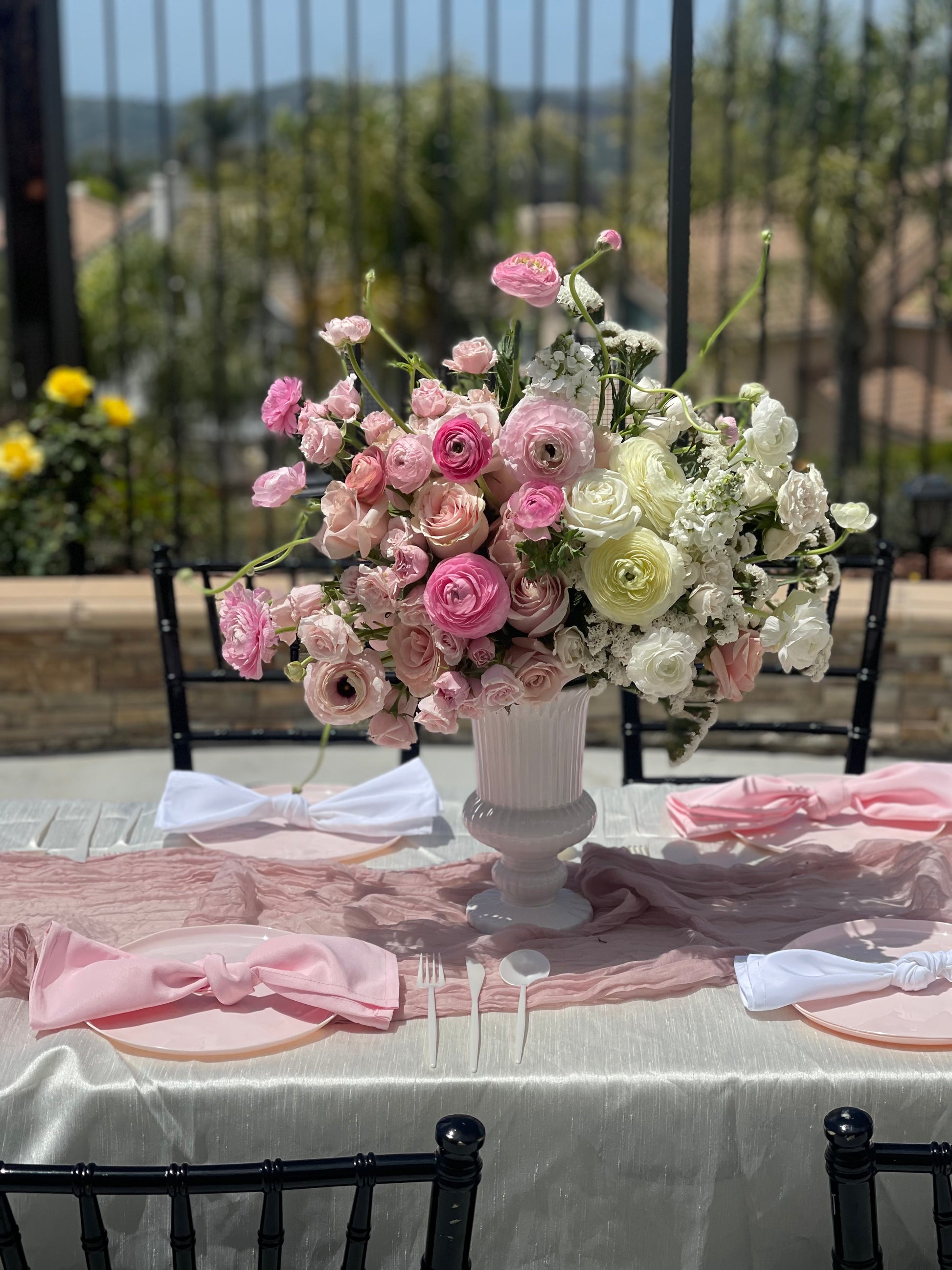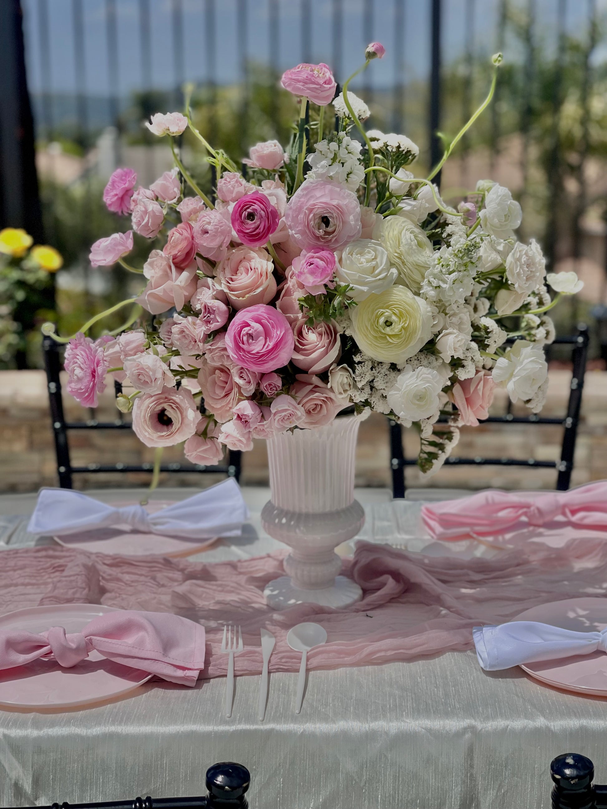 In this exquisite arrangement, we've meticulously curated a symphony of premium blooms, meticulously selected to elevate any space with their unparalleled beauty. Immerse yourself in the ethereal charm of soft, pink hues blending seamlessly with pristine whites, creating a mesmerizing monochromatic palette that exudes tranquility and refinement.