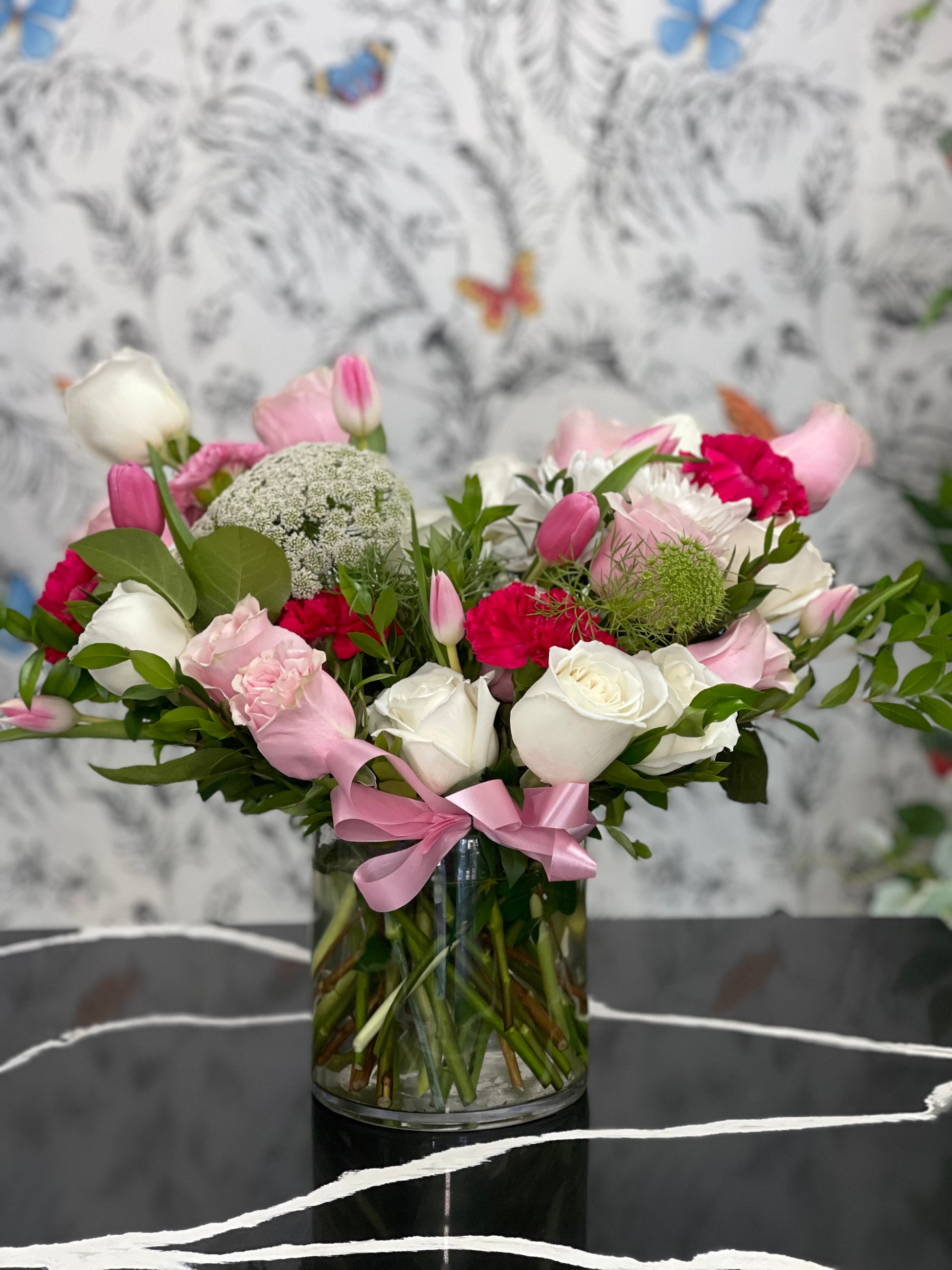 Delicate, romantic, and timeless, the Lana Bouquet is the perfect way to celebrate life's special moments. This elegant arrangement features premium pink Mondial roses, classic Vendella roses, ethereal Queen Anne’s lace, and graceful tulips, all arranged in a chic clear 5x5 glass vase. Its soft pink and white palette embodies sophistication and charm, making it an ideal gift for birthdays, anniversaries, or simply to brighten someone's day.