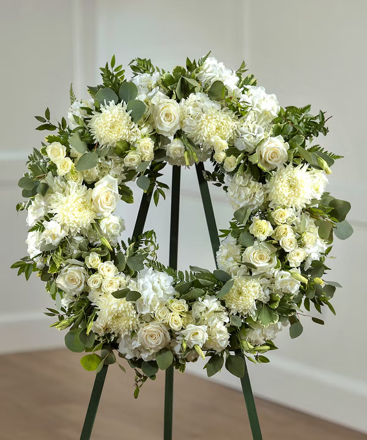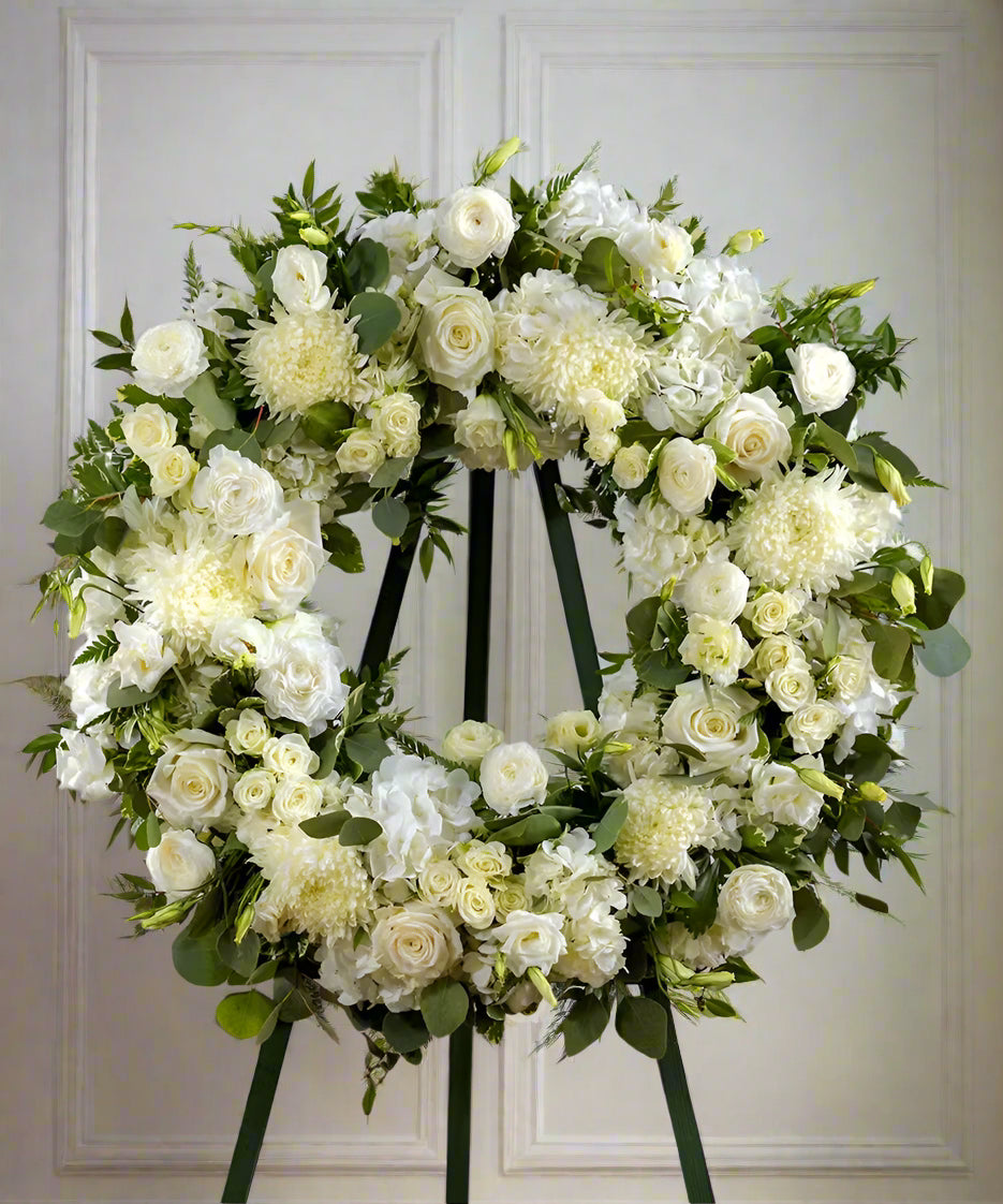 Send a meaningful and elegant floral tribute with the Lush Sympathy Wreath, a beautiful expression of sympathy, love, and remembrance.