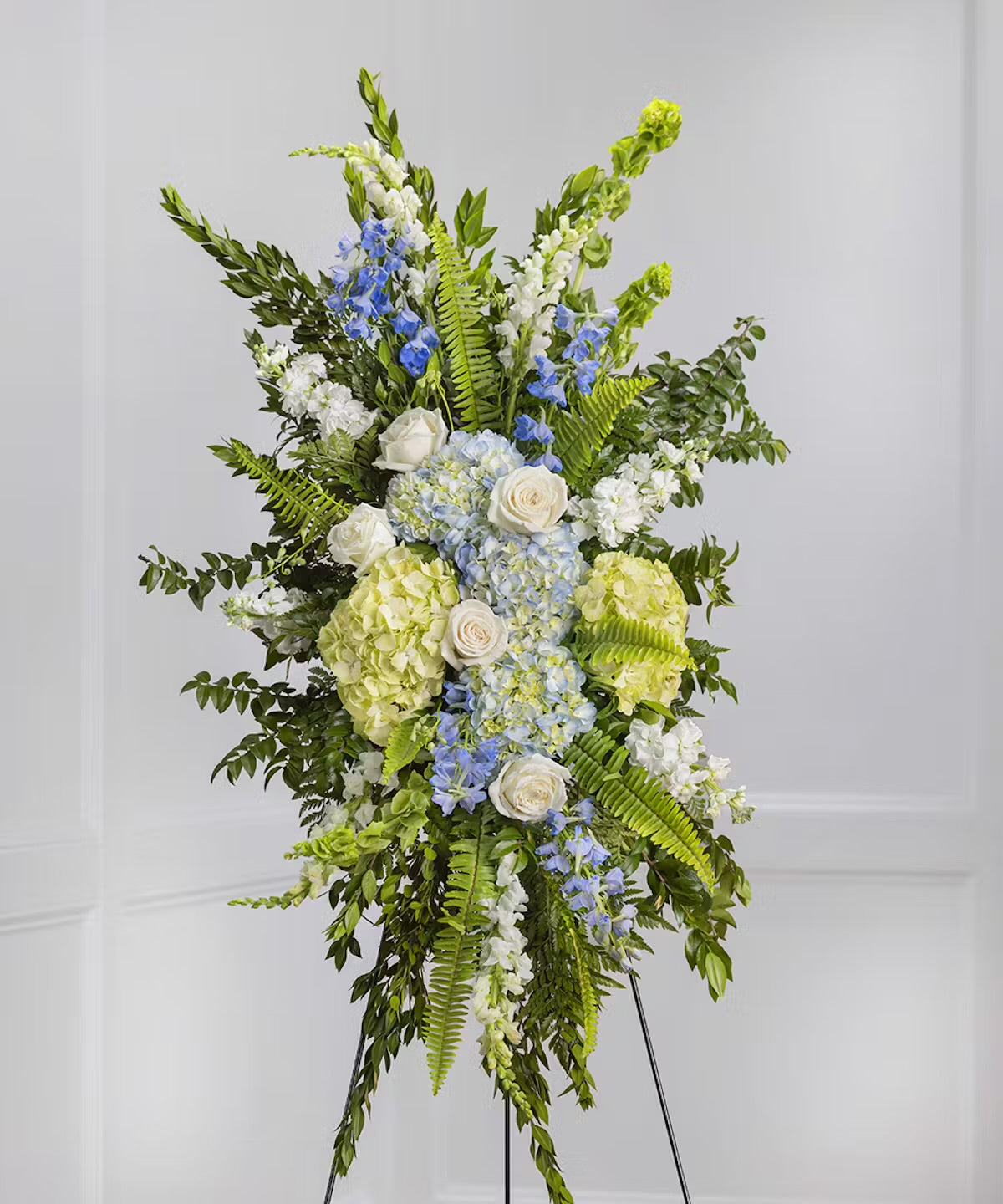 The Marina Sympathy Spray is a graceful and serene floral tribute, designed to bring peace and comfort to funeral and memorial services. This standing spray features a harmonious blend of blue and green hydrangeas, white roses, snapdragons, and delphiniums, complemented by lush greenery, myrtle, sword fern, and palm leaves.