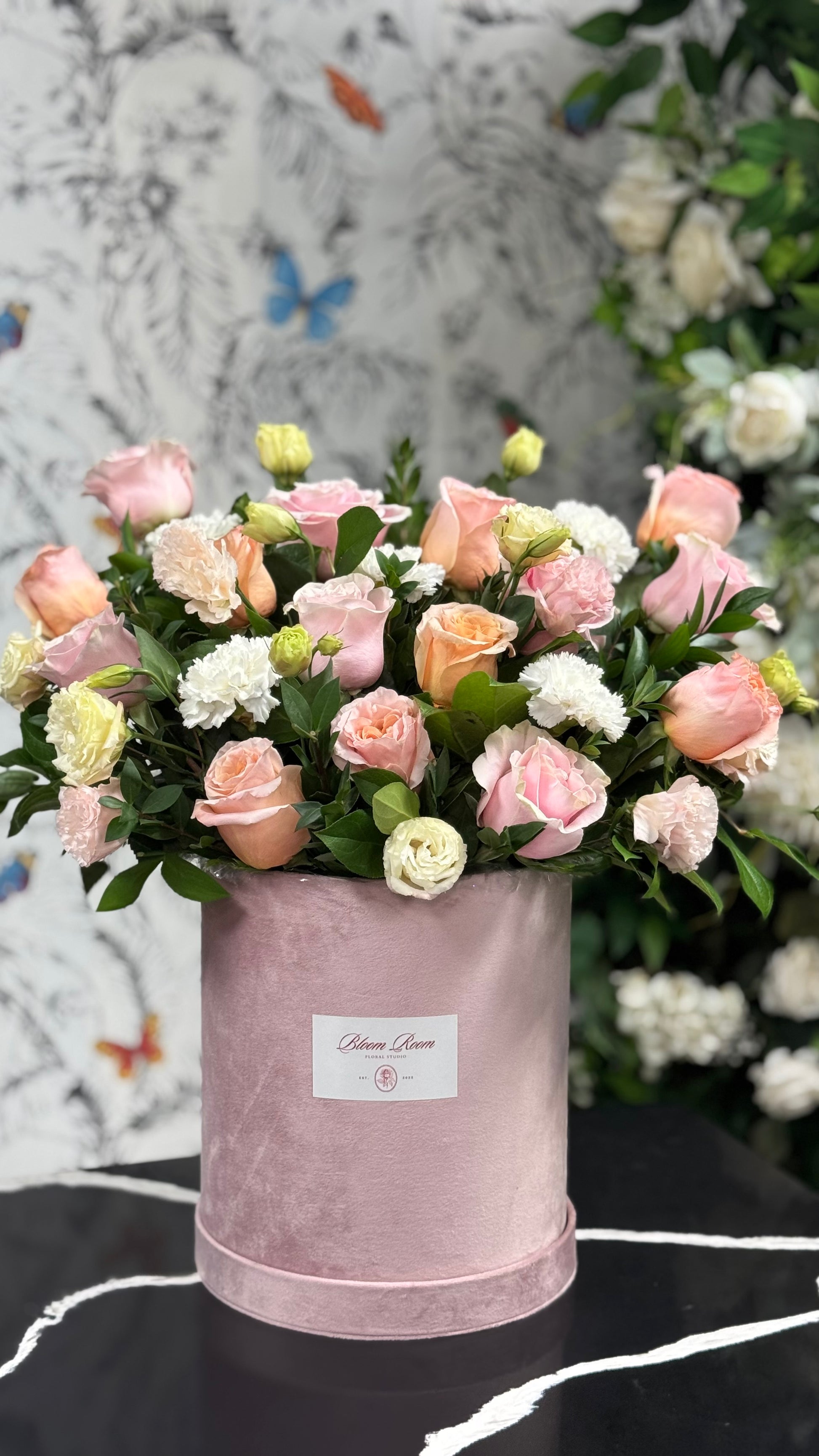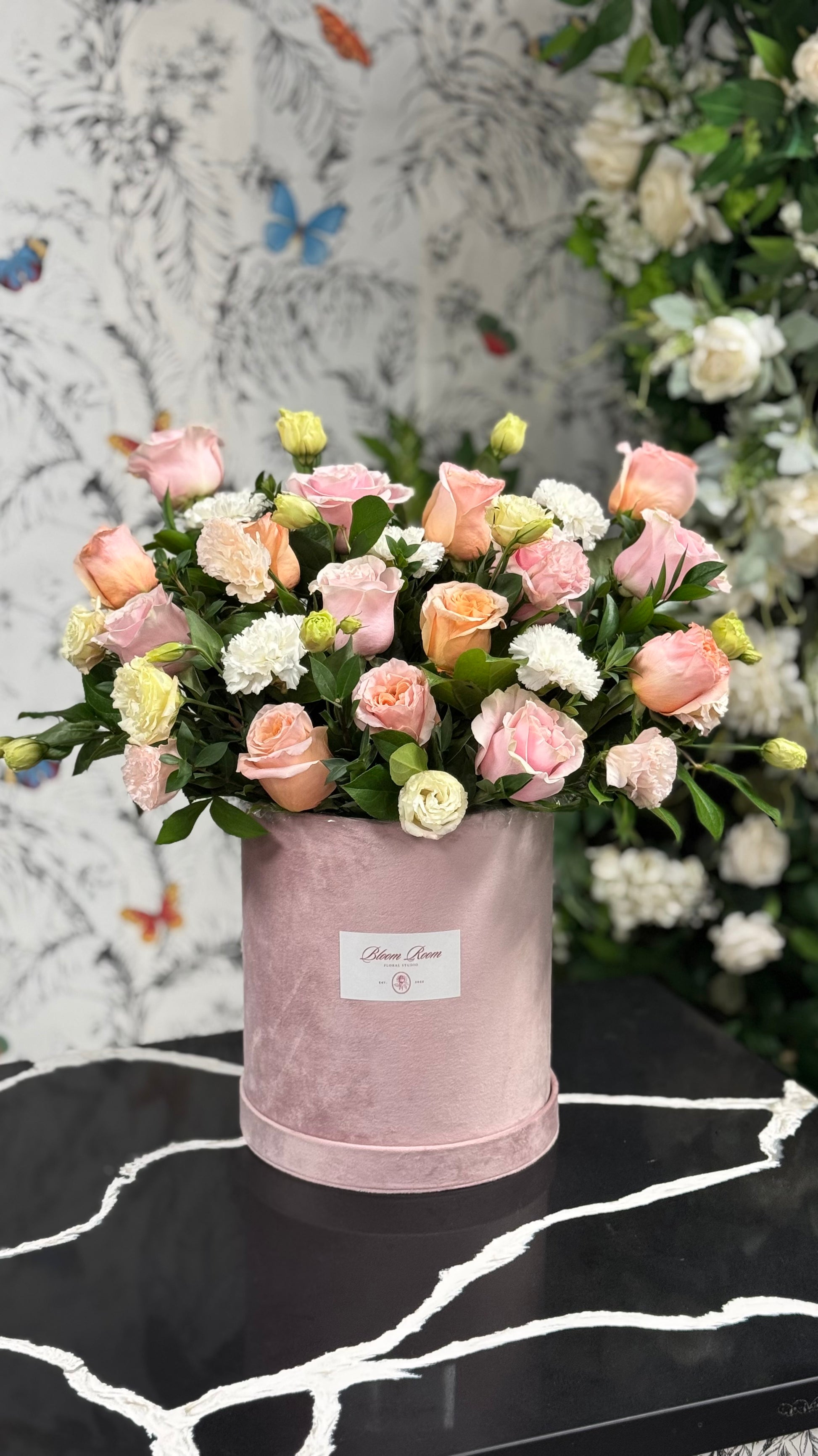 Delight in the beauty of our Mixed Garden Box, an exquisite floral arrangement featuring premium roses, lisianthus, carnations, and other hand-selected fresh seasonal blooms. This lush bouquet is artfully arranged in a chic luxury hat box, making it a sophisticated gift for any occasion.