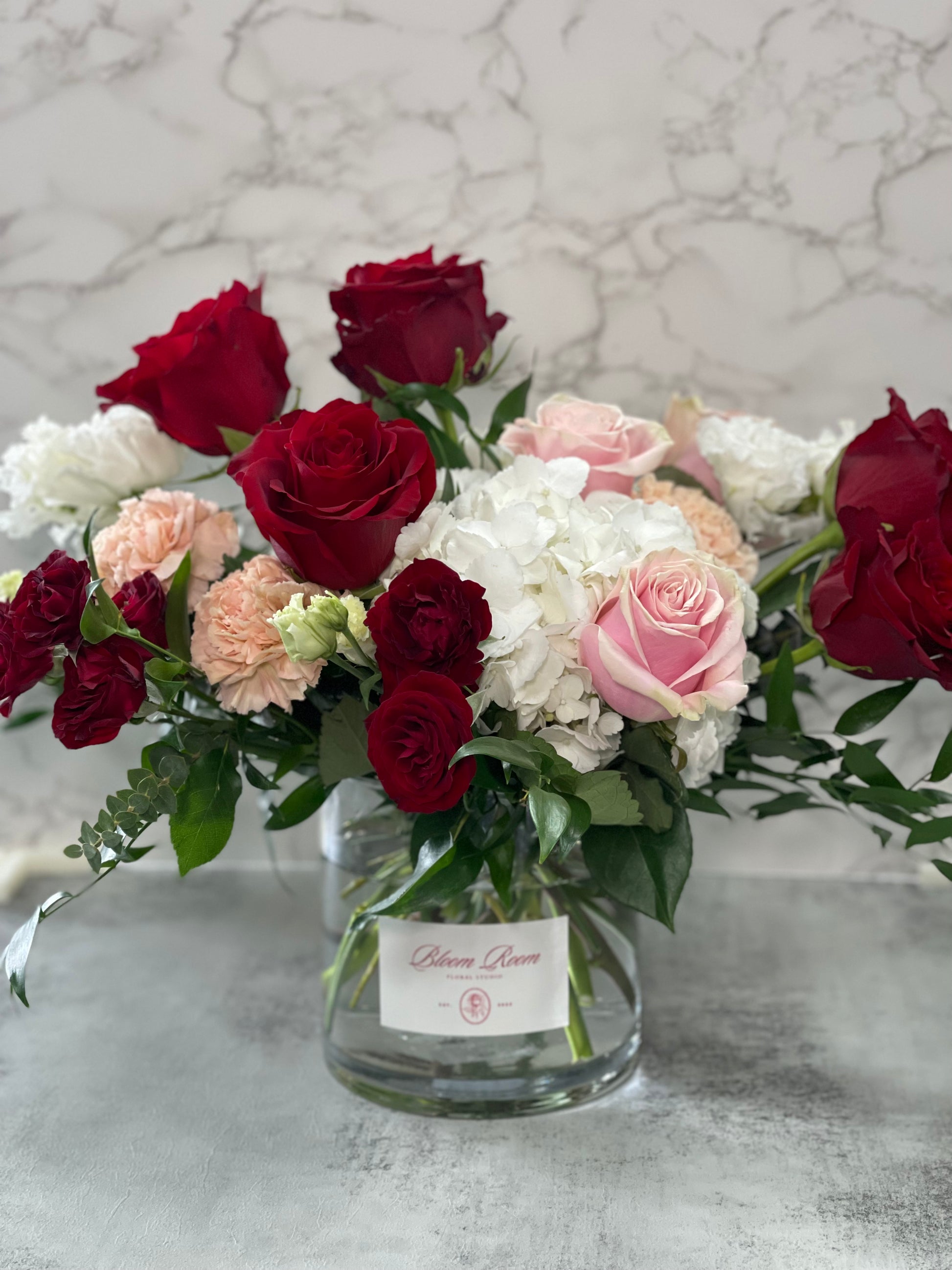 A stunning selection of deep red and pink roses, fluffy hydrangea, lisianthus, and spray roses is softened with beige carnations and elegantly framed by Italian ruscus, all thoughtfully styled in our classic glass Nicole vase. Perfect for Mother’s Day, romantic gestures, or a refined gift that speaks volumes.