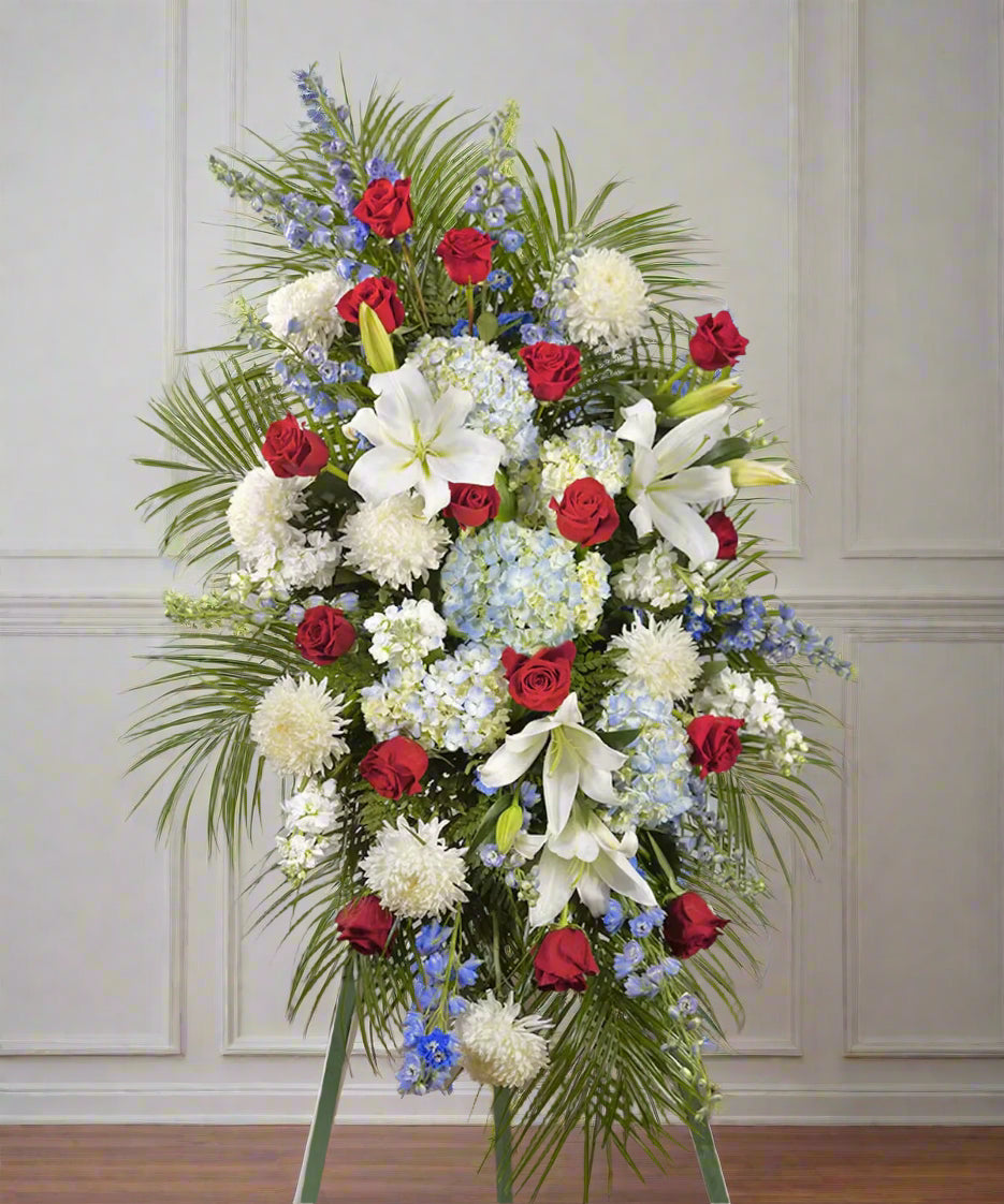 The Patriot Sympathy Spray is a striking red, white, and blue floral tribute, symbolizing honor, courage, and remembrance. Designed to pay tribute to veterans, service members, and patriots, this standing spray is a dignified expression of respect and gratitude.