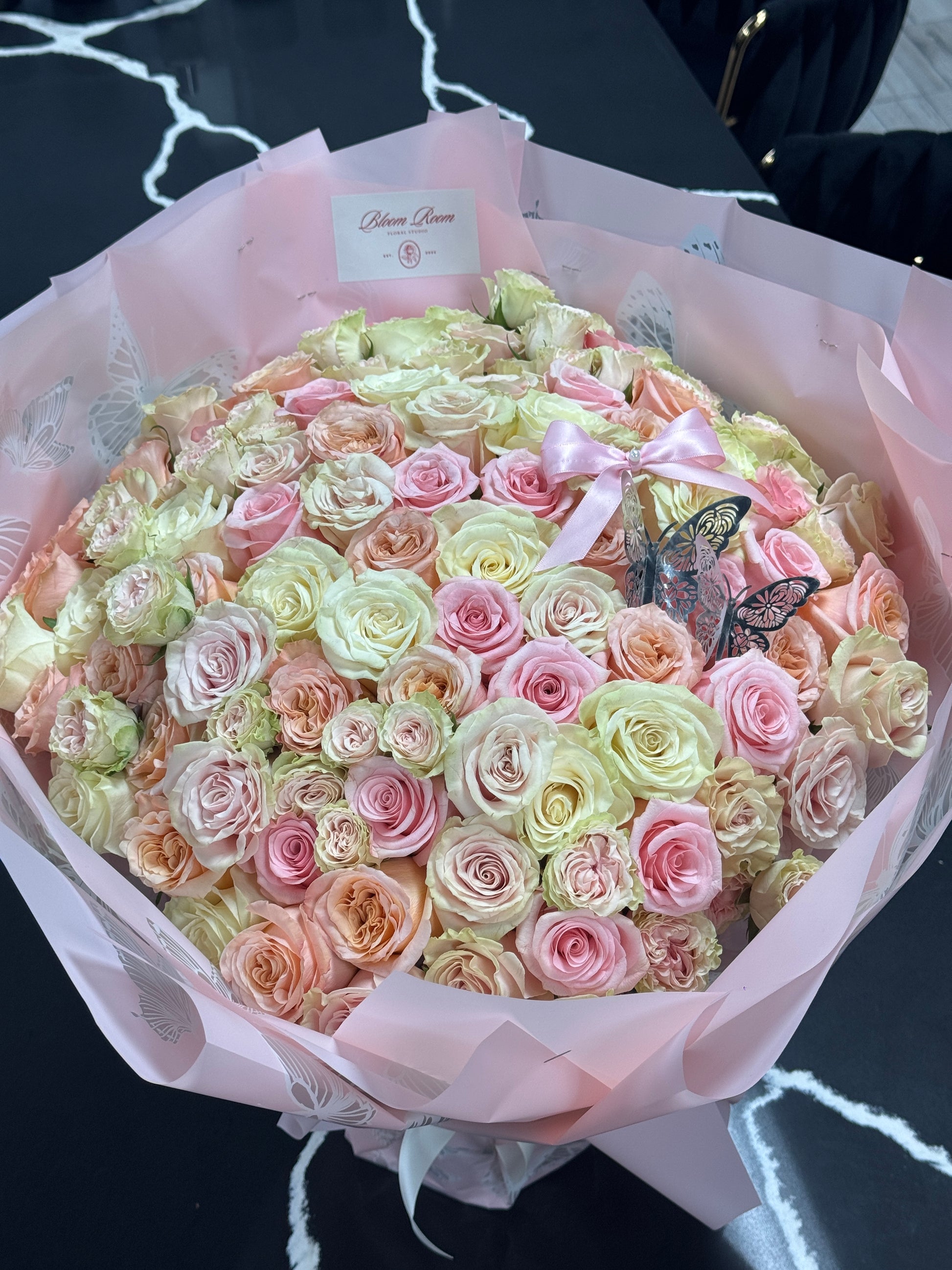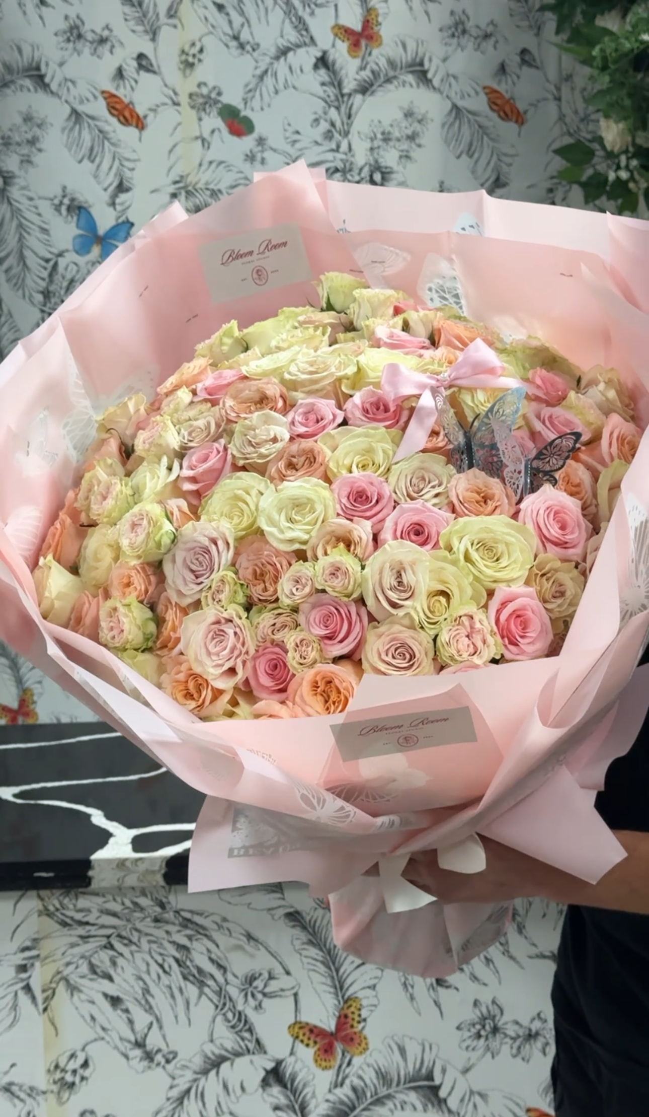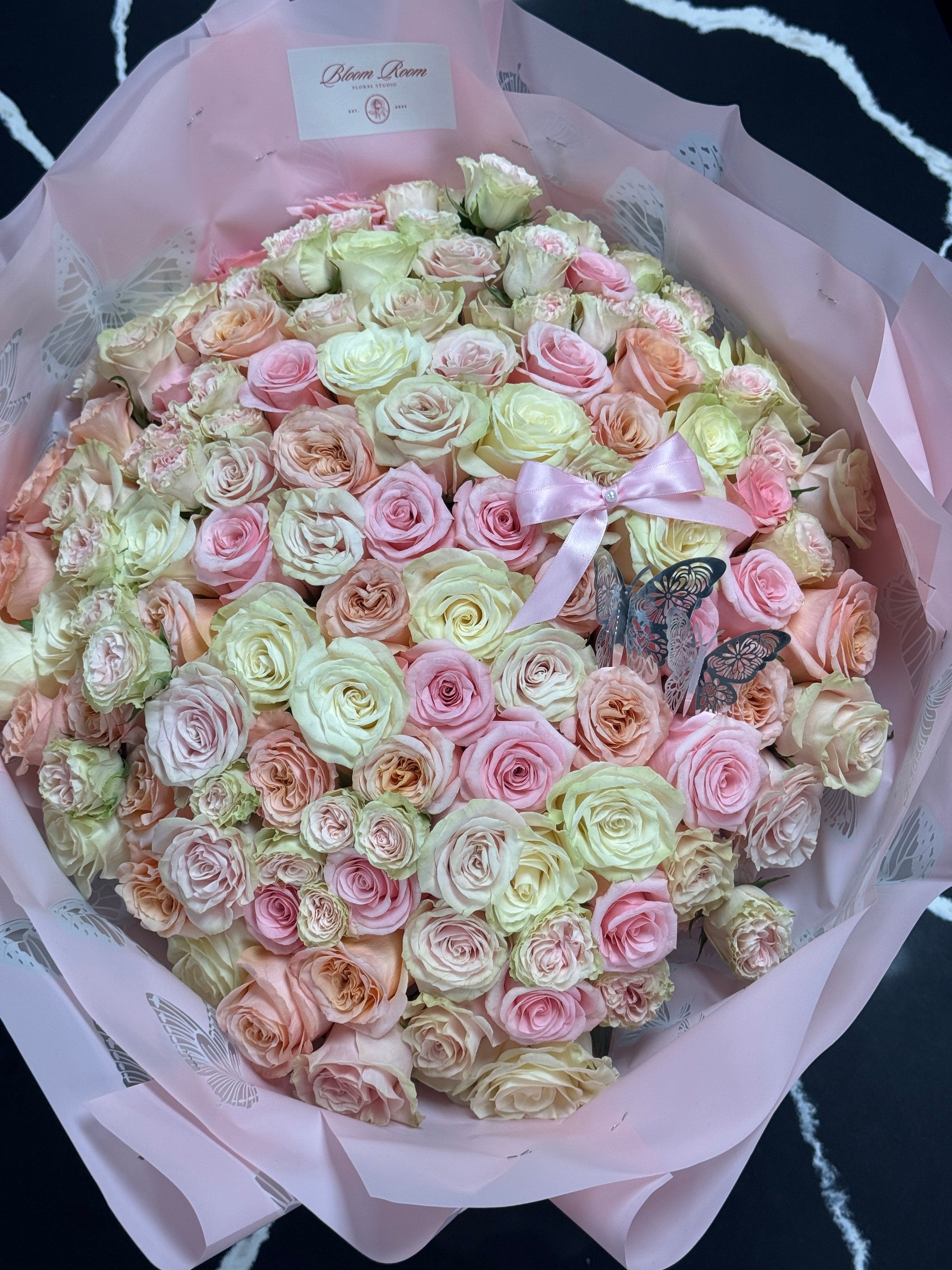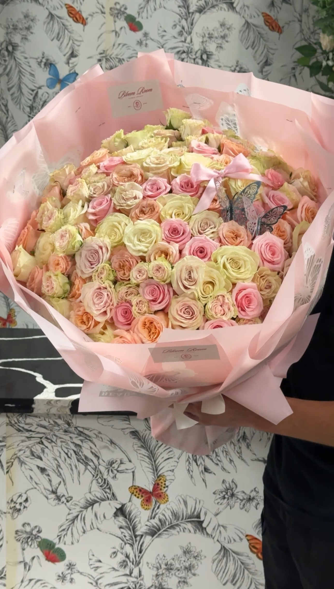 Experience true luxury with the Princess Treatment Bouquet, an extravagant floral masterpiece featuring 100 long-stem imported roses in elegant shades of pink and cream. Wrapped in stunning pink butterfly-themed wrapping paper, adorned with delicate bows and butterfly accents, this bouquet exudes elegance and sophistication.