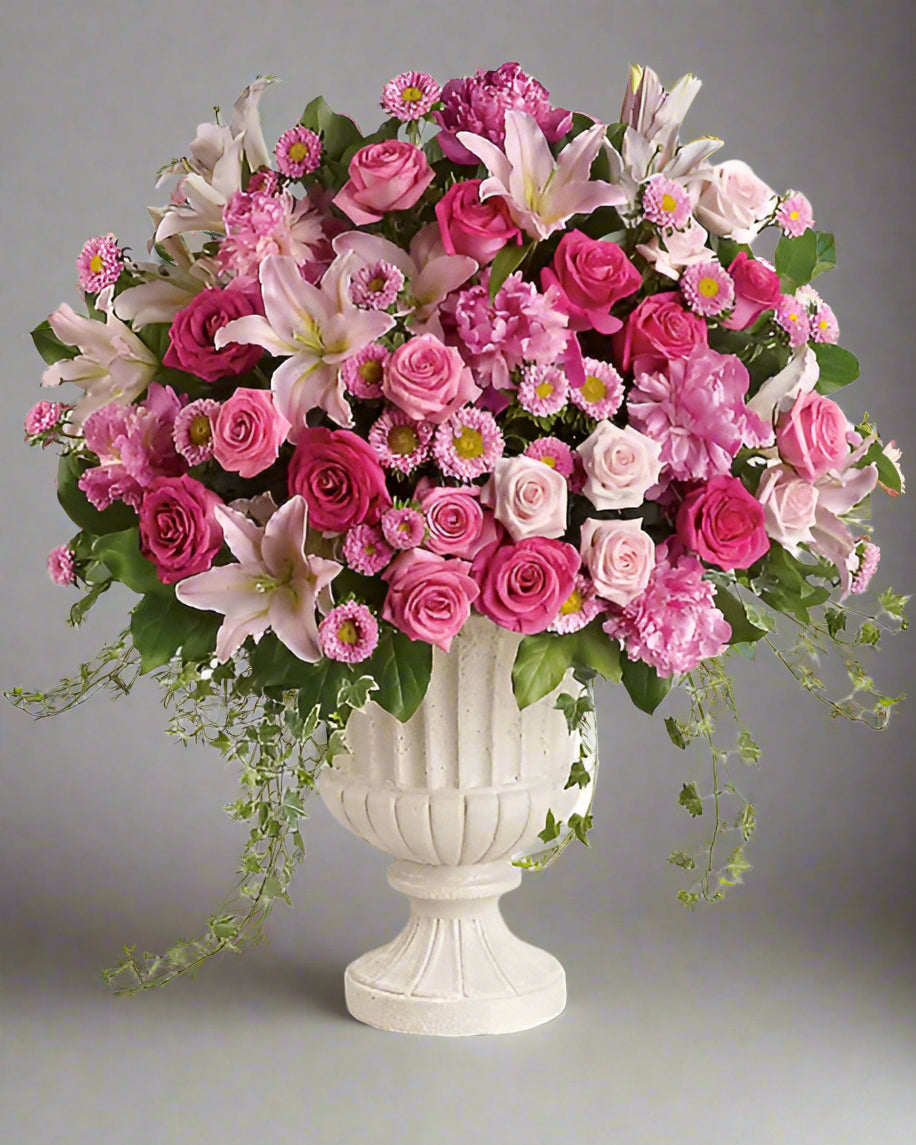 Step into luxury with Queen of the Castle, a regal floral display curated by Bloom Room, your trusted Orange County florist. This front-facing arrangement is designed to impress, showcasing a lavish selection of blooms in soft, romantic tones of pink and ivory. Nestled in a timeless ceramic Roman vase, this grand piece is perfect for celebrating Mother’s Day, honoring someone special, or elevating an interior space with elegance.