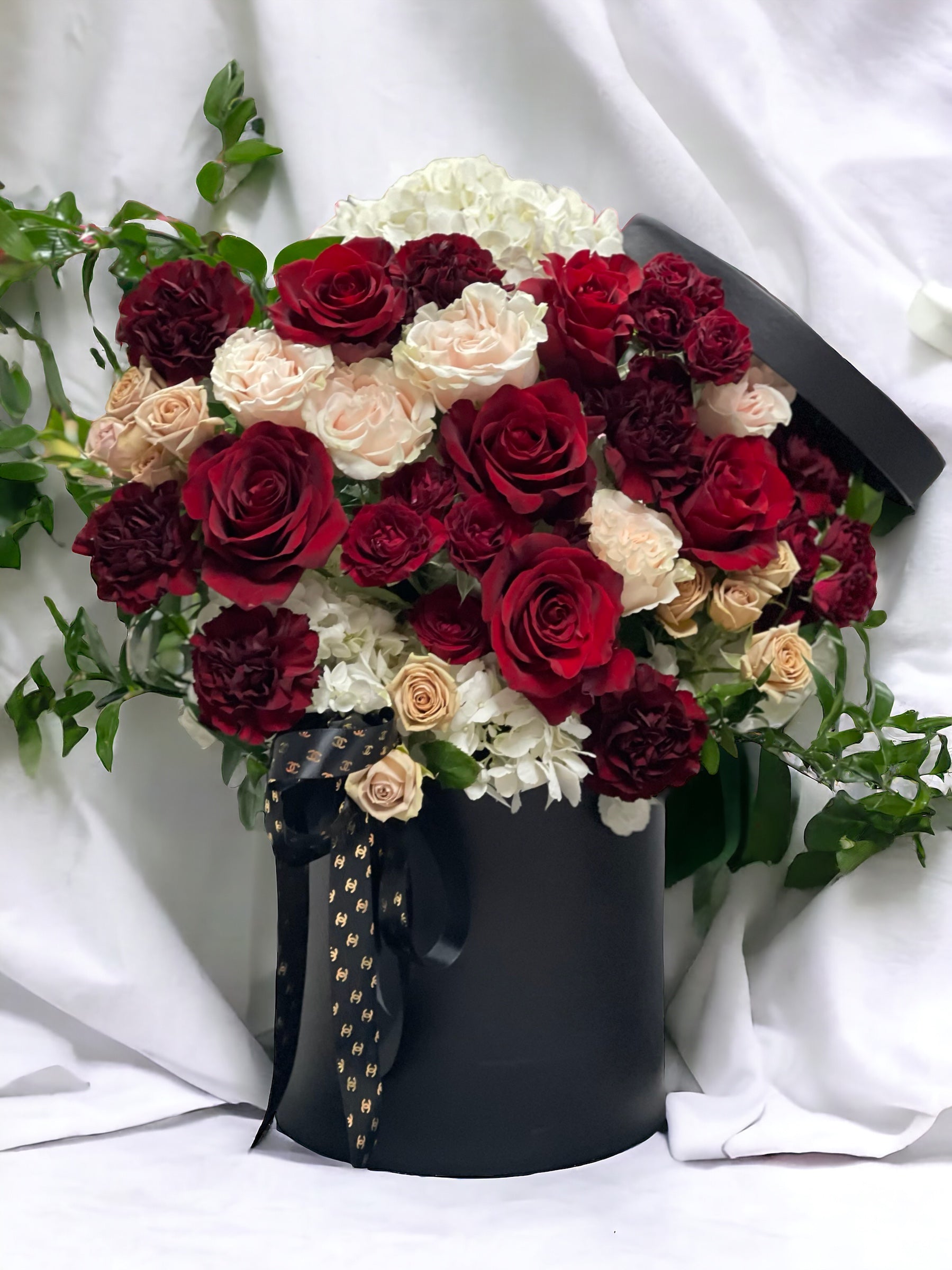 Gift a timeless expression of romance and elegance with Romeo's Juliet Box. This luxurious hat box is beautifully filled with lush, deep red Ecuadorian roses, premium ivory garden roses, toffee spray roses, and delicate hydrangea, creating a statement of heartfelt devotion. Accented with Italian ruscus and charming carnations, each bloom whispers of undying love and the passion of hearts’ deepest secrets.