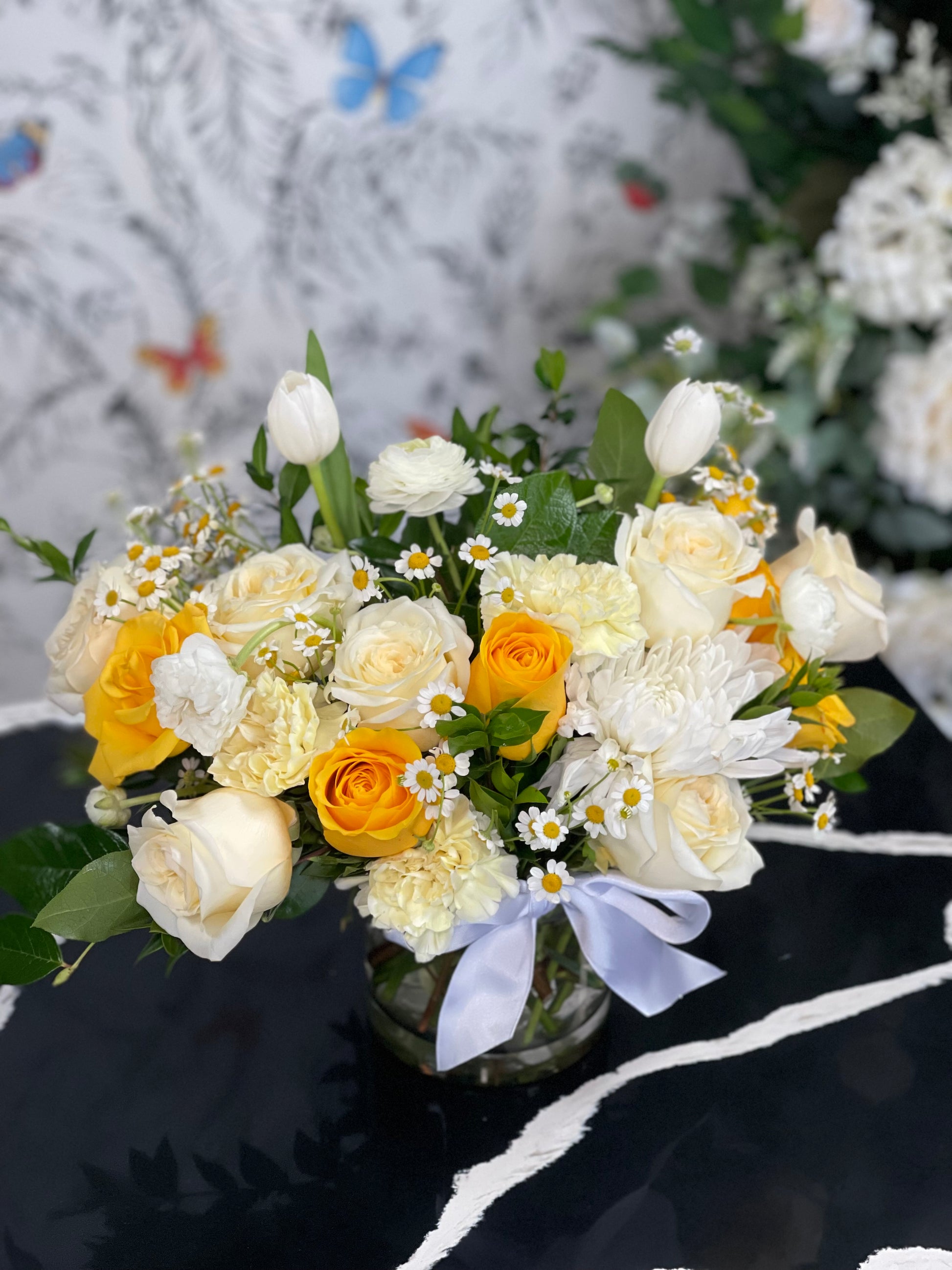 Infuse your living space with the radiant warmth of the sun-kissed Saffron Vase Arrangement from Bloom Room. A harmonious blend of delicate hues and fragrances, this enchanting ensemble captures the essence of a sunlit garden in full bloom.