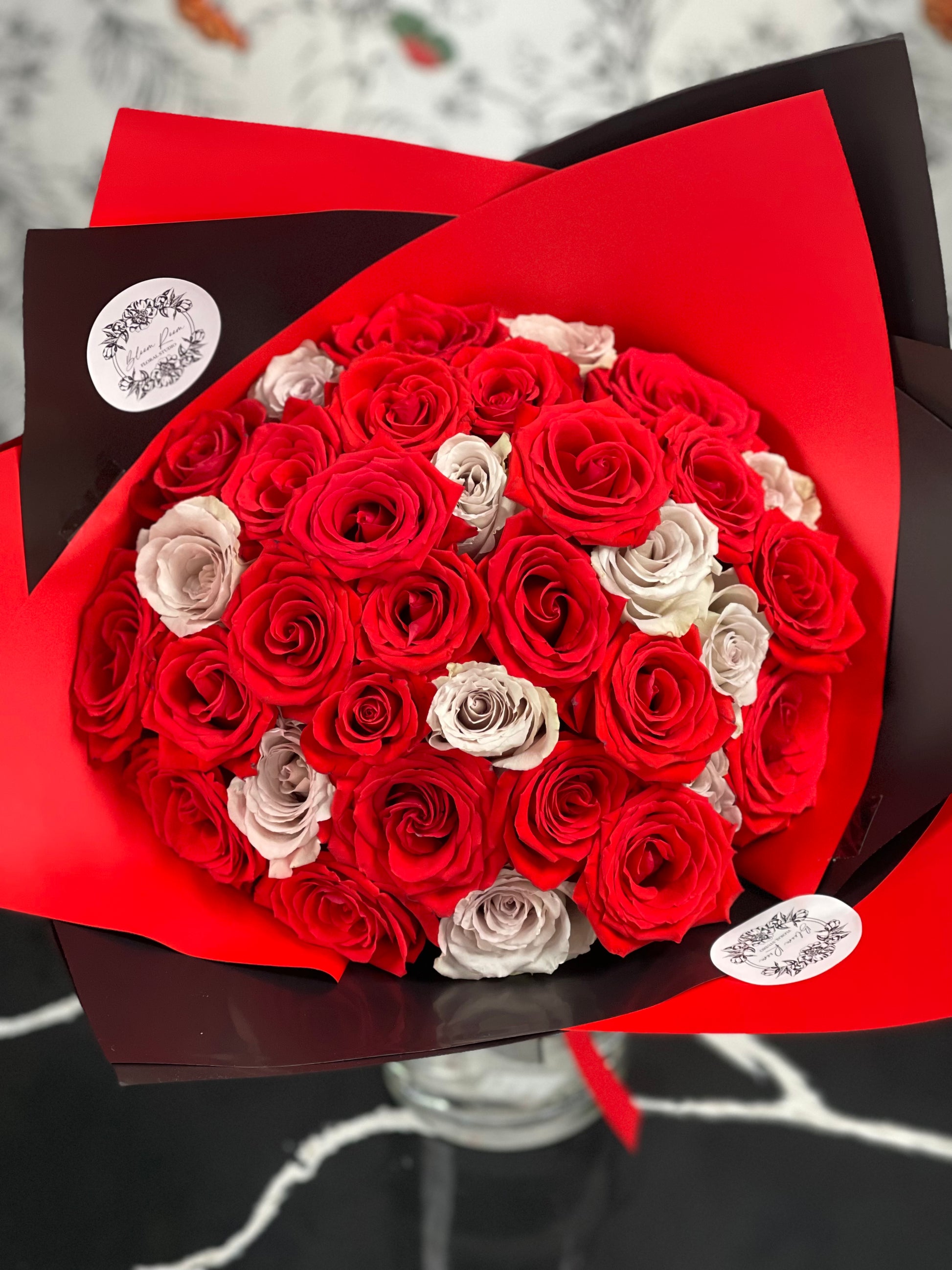 Indulge in the captivating beauty of our Selena Bouquet, featuring an exquisite combination of large Nina red roses and elegant Quicksand nude roses. This luxurious arrangement is wrapped in stylish black and red wrapping paper, making it a perfect choice for expressing love and affection on any special occasion.