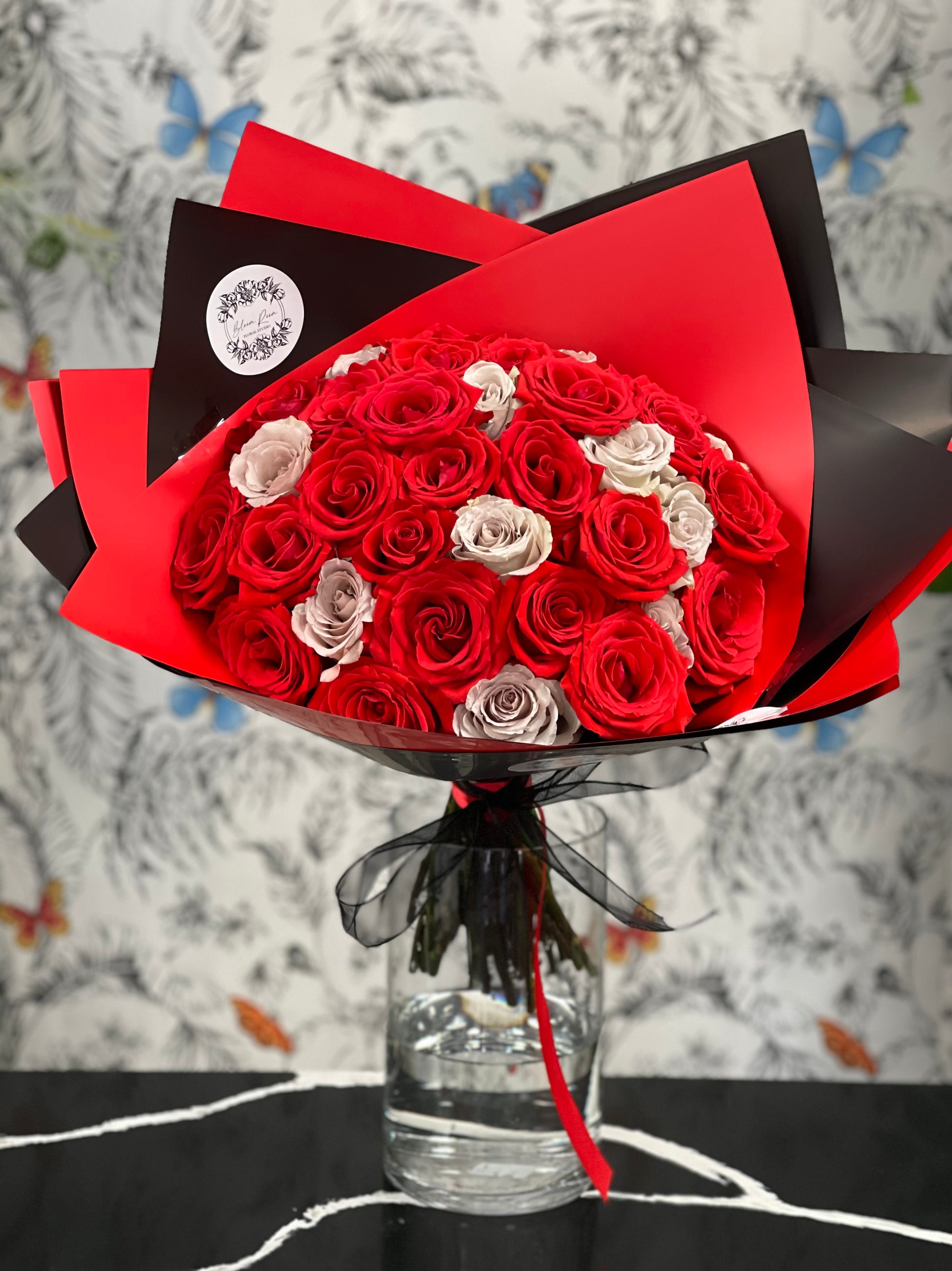 Dramatic Presentation: The chic black and red wrapping enhances the bouquet's allure, making it a striking centerpiece for celebrations, anniversaries, or intimate gatherings.